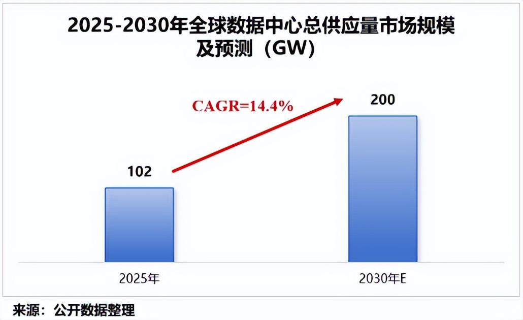 数据显示,2025年,全球数据中心总装机量为102GW;预计到2030年,全球数据中心总容量将增至200GW,增幅接近一倍。