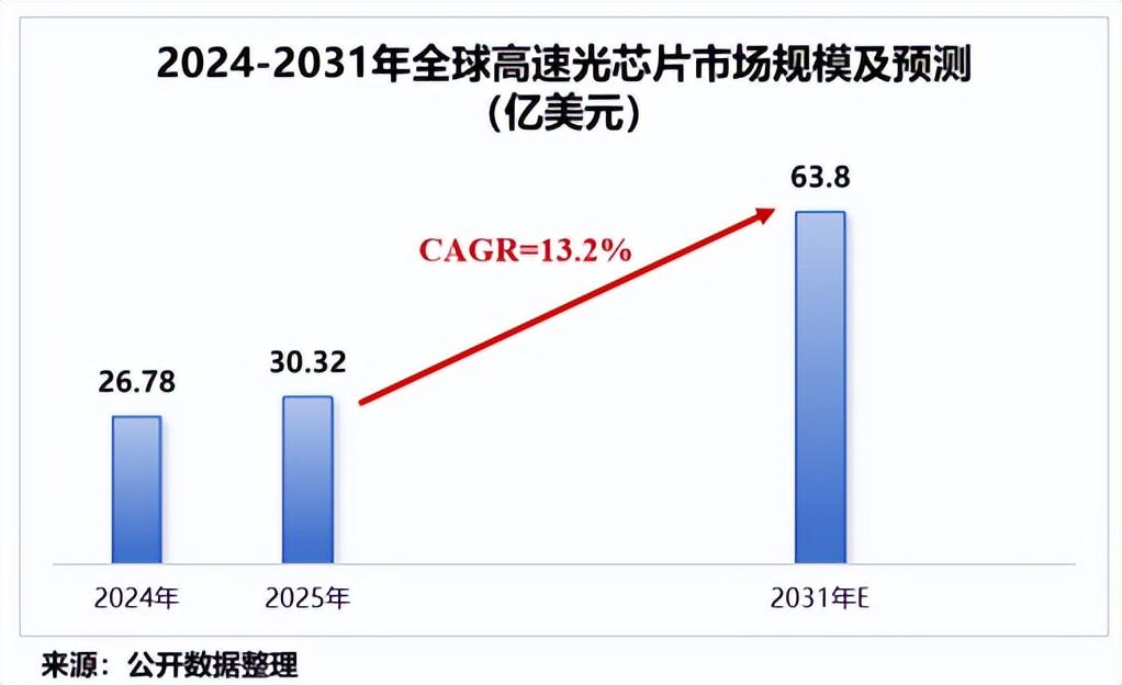 据权威机构统计及预测,2024年,全球高速光芯片市场销售额达26.78亿美元;预计2031年,该市场规模将达到63.80亿美元;2025年至2031年的年复合增长率为13.2%。