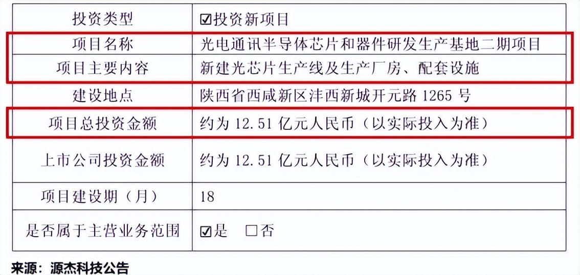 就在1月10日,源杰科技发布公告称,公司拟投资12.51亿元,用于建设光电通讯半导体芯片和器件研发生产基地二期项目。