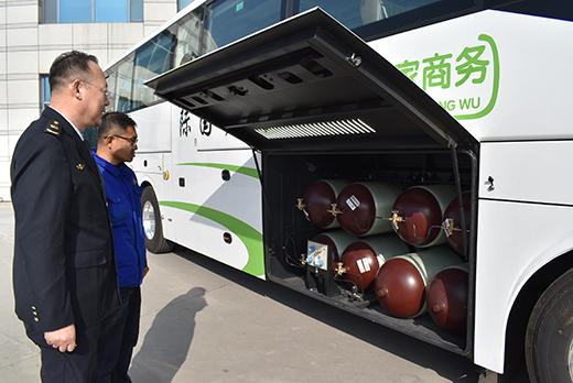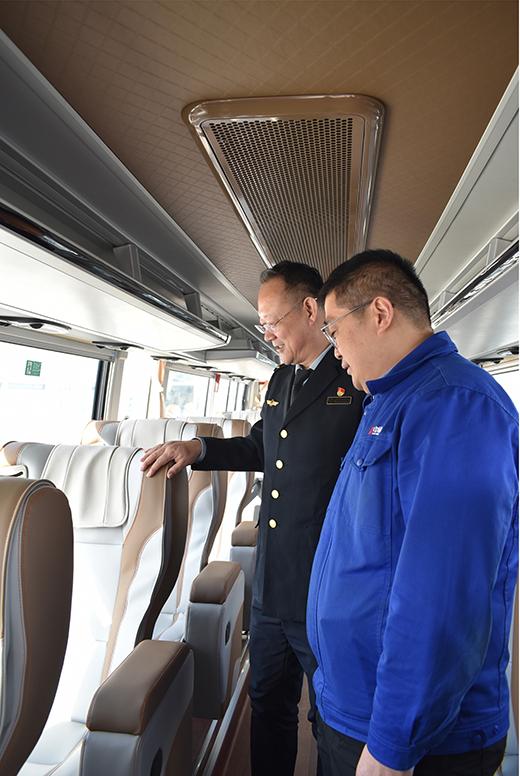 吉学刚(右一)向李新勇(右二)介绍客车内饰与安全配置