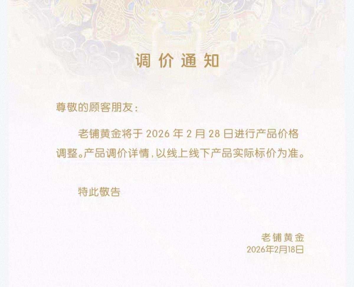 红星资本局2月19日消息,老铺黄金(06181.HK)淘宝旗舰店昨日发布调价通知称将于2026年2月28日进行产品价格调整。产品调价详情以线上线下产品实际标价为准。
