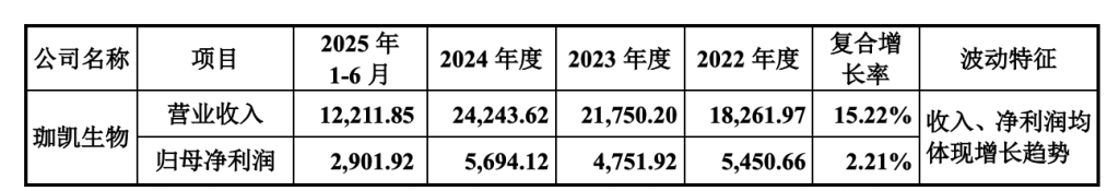 数据显示,2022年至2024年及2025年6月末,珈凯生物营业收入分别为18261.97万元、21750.20万元、24243.62万元及12211.85万元。2023年度、2024年度及2025年上半年营业收入分别较上年同期增长了19.10%、11.46%及12.28%,销售收入呈不断增长态势。