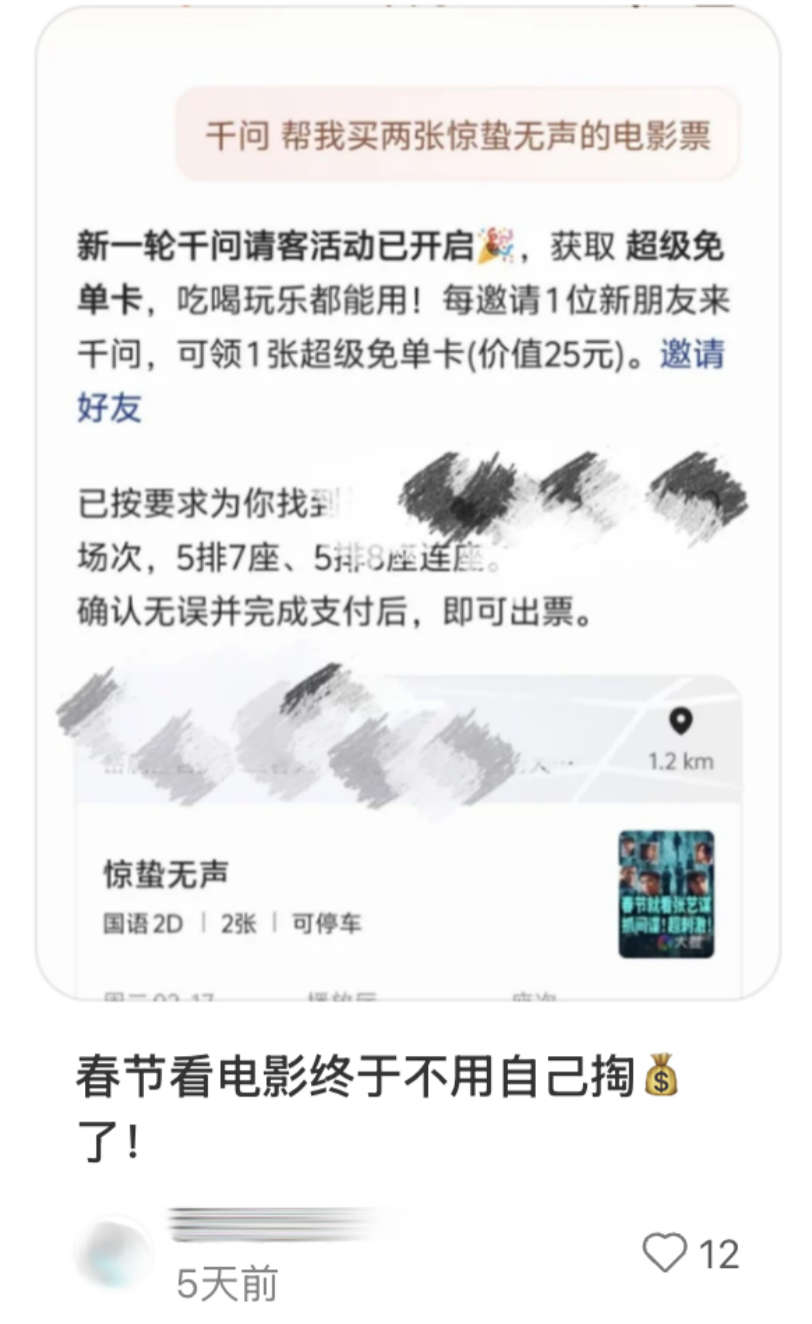 除了最高频的奶茶,复杂的消费决策也被AI接管。以春节档选片为例,过去带全家人看电影是一场脑力消耗战,查评分、选影院、抢座位,生怕全家老小难得团聚却看了个烂片。现在只需一句话:“帮我们一家三口买大年初七《惊蛰无声》的票,找离家最近的影院”,千问会智能推荐合适的电影票与时间,并自动锁定理想座位。