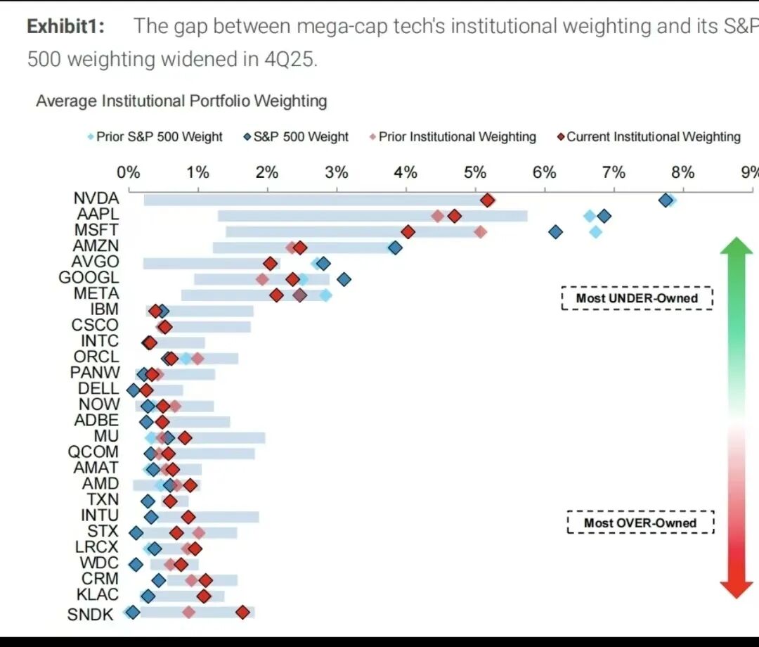 美股机构投资者对科技巨头持仓严重滞后,像英伟达、苹果、微软这种超级大盘股,机构实际持仓权重远低于它们在标普500指数中的权重,形成巨大的“低配”缺口,尤其是英伟达和苹果,在标普500指数中权重在7%-9%左右,但机构持仓只有5%。