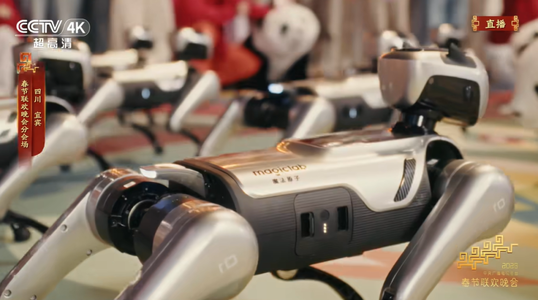 宜宾分会场的百台MagicDog四足机器人,以“机器熊猫”造型完成全球首次大规模群控表演,憨萌的姿态搭配无延迟的协同调度,成为春晚收视率最高的片段之一。
