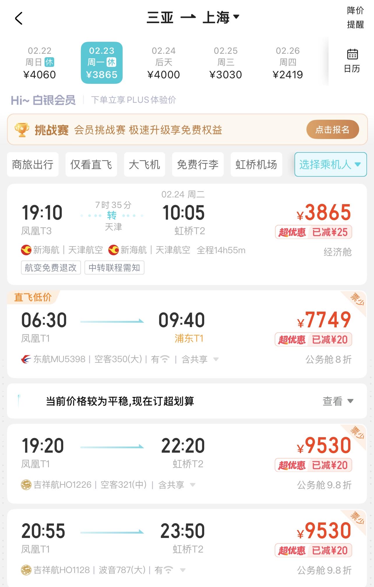 例如,2月23日假期最后一天,海口飞广州的直飞航线已售罄,购票平台推荐的中转航线售价在5700元到9900元不等;三亚飞上海、北京的直飞航线经济舱售罄,仅剩少量公务舱全价票,最贵票价近万元。