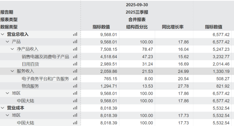 阿里同样受到行业环境影响,前三季度营业收入同比增速不足6%,相较于2024年下降2个百分点;而京东则实现逆势高增长,2025年前三季度营业收入同比增长17.86%,相较于2024年的6.84%大幅提升。