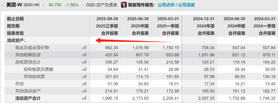 截至2025年三季度末,美团的流动资产相较于2024年年末减少了百亿,而在此前数年,美团的流动资产始终保持上涨趋势,这一转变意味着其流动性压力正在加大。