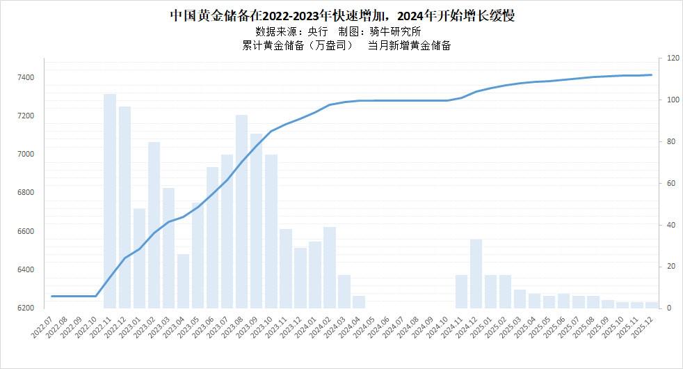 不少小作文用人民银行黄金储备持续增加作为购买黄金的依据。但大家需要注意,中国央行2026年1月末黄金储备报7419万盎司,2025年12月末为7415万盎司,为连续第15个月增持黄金。但增持数量仅4万盎司,而且央行自2025年以来每月新增黄金储备都未超过8万盎司,仅为2023—2024年俄乌开战前两年月均增持黄金储备数量的5%左右。