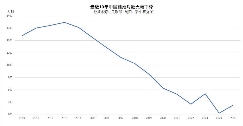 10年前的2016年,全国结婚登记1143万对,2025年全国结婚登记下降至676万对,10年结婚登记人数减少了40%。