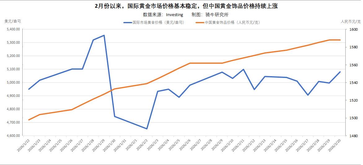 与1个月前的1月22日相比,国际市场黄金期货价格从每盎司4949.4美元上涨至5080.9美元,仅反弹2.6%。但黄金饰品价格从每克1498元上涨至1588元,大幅上涨了6%。