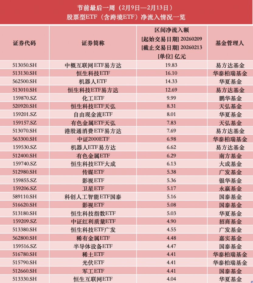 春节长假效应显现,股票型ETF在节前最后一周遭遇资金明显撤离。