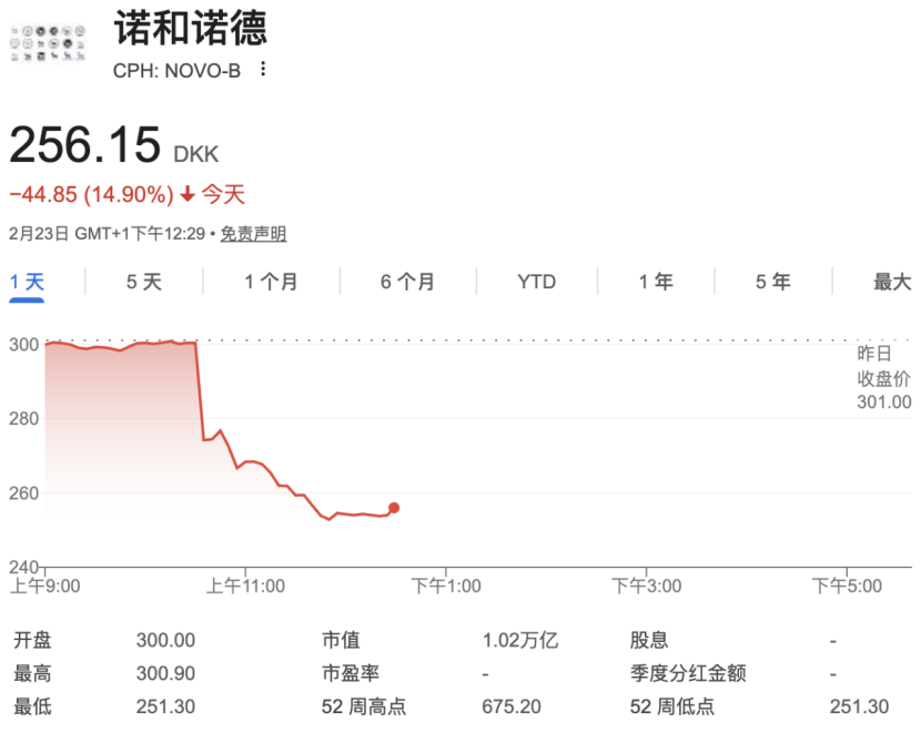 2月23日,欧洲股市开盘后,诺和诺德股价直线跳水,盘中一度大跌超15%,截至北京时间19:30,跌幅仍达14.9%,跌至2021年6月以来最低水平。美股盘前,诺和诺德股价亦大跌超14%。