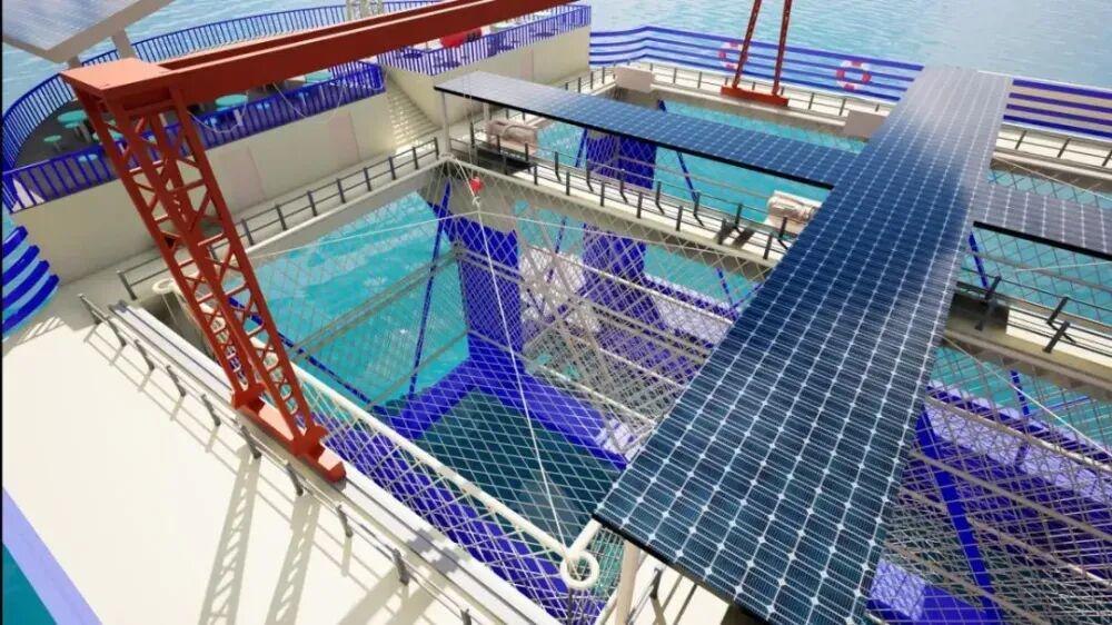首创的船网融合,使船体由15根立柱构成开放的水下宫殿,养殖舱与大海直接连通,实现水体自然交换,为鱼类提供了接近野生的生长环境。