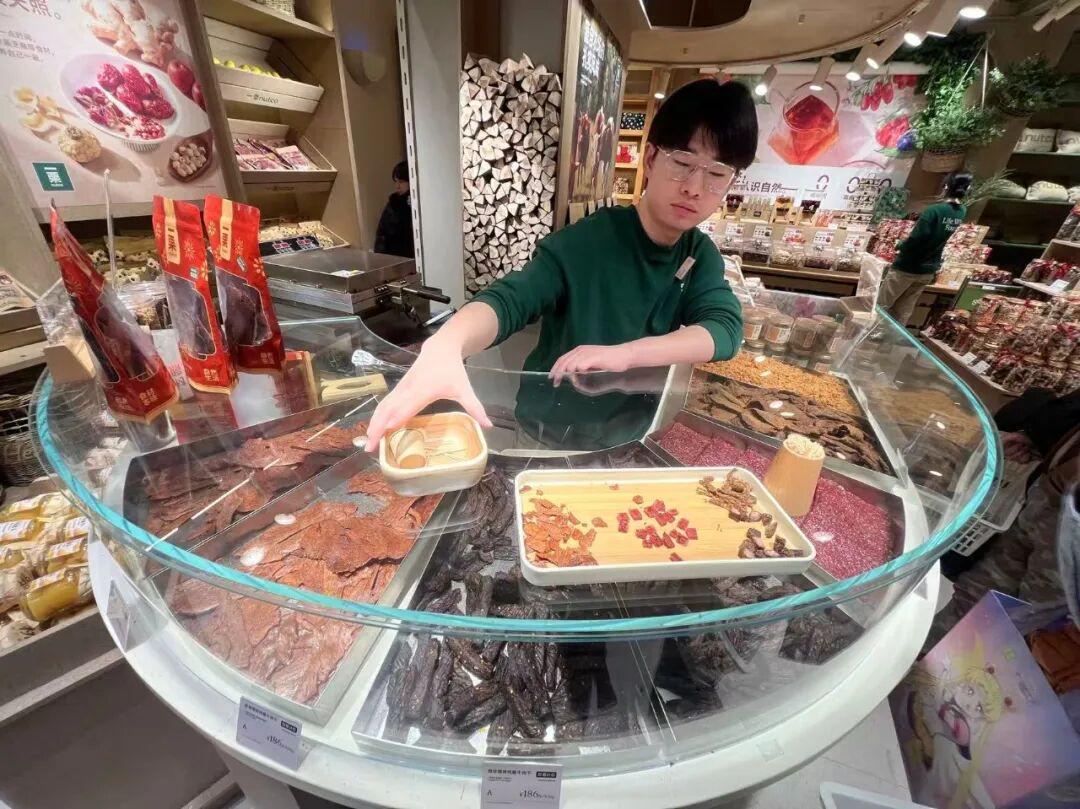 既有低频品类,也有中高频品类;既做非刚需的零食,也做佐餐;既有大量轻加工“原生态”的现制表演项,也大排面陈列了工业品;整个门店好像没有重点,又好像都是重点。