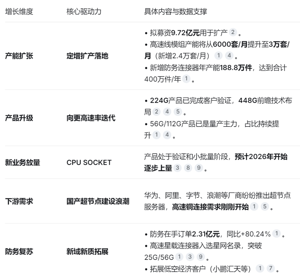 AI算力驱动的“高速铜连接”放量这是公司2025年业绩爆发的最核心原因。随着以华为昇腾为代表的国产AI芯片向“超节点”形态演进(如910C及后续型号),服务器内部及之间的互联带宽需求呈倍增趋势。在短距离传输中,成本更低、能效更优的铜缆互联方案成为主流选择。