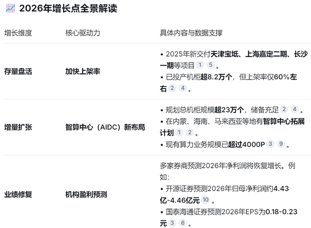 将2025年大量交付的“库存”机柜转化为实际收入,是2026年最直接的业绩增长点。2025年公司机柜投放创下历史记录,全年新投放超过2.6万个。这就像开了很多新店,但店里顾客还不多(上架率60%)。因此,2026年公司最重要的工作就是“促销”,即提升已投产项目的上架率。随着AI应用和企业上云的需求持续释放,将空余机柜尽快租出去,是今年业绩能否改善的关键。