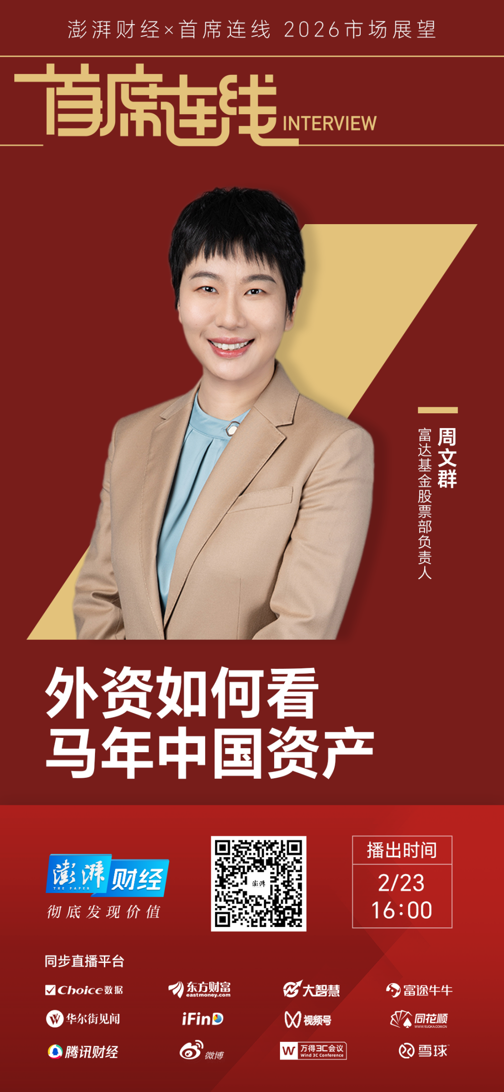 “对于整个2026年A股市场的看法,我们持有非常正面的态度。”2月23日,富达基金股票部负责人周文群做客澎湃新闻”春水向东流——《首席连线》2026年市场展望”专题时表示。