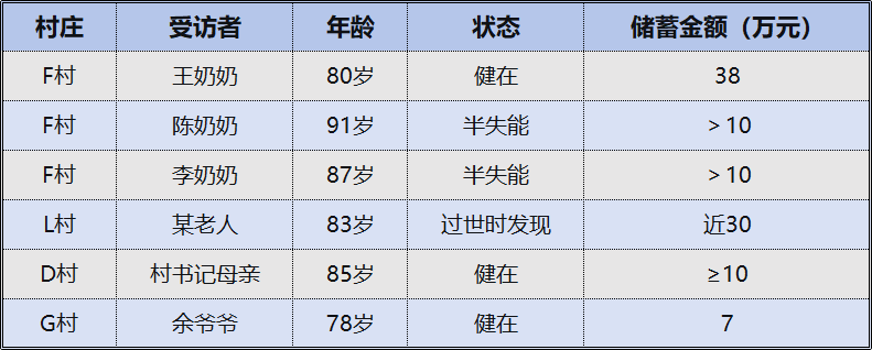 典型案例包括:F村80岁王奶奶有38万元积蓄;同村91岁半失能老人陈奶奶银行账户上有10余万元;87岁半失能老人李奶奶自己手头亦有10余万元;L村一位83岁老人去世后被家人发现存有近30万元;D村村书记的85岁母亲也攒到了至少10万元;G村78岁余爷爷手头存有7万元。