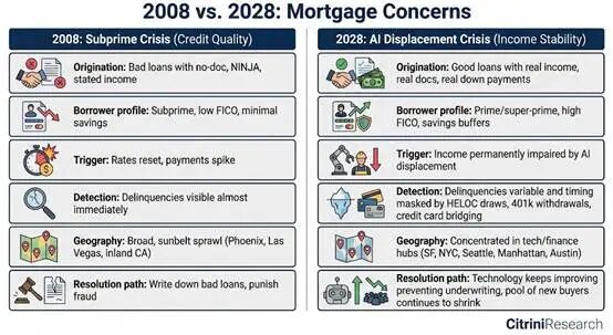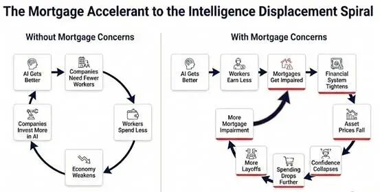 这是一个没有自然制动器的负反馈循环。即“人类智能替代螺旋”。白领工人的收入能力(以及理性上的支出能力)受到了结构性损害。他们的收入曾是 13 万亿美元抵押贷款市场的基石——这迫使承销商重新评估优质抵押贷款是否仍然安全。