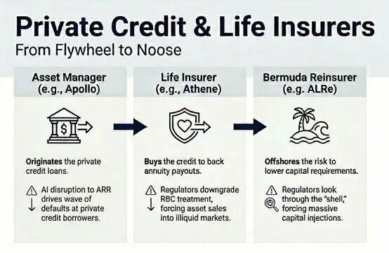 这些损失冲击了那些旨在持有非流动性资产以应对长期债务的资产负债表。原本应该使系统保持韧性的“永久资本”并非某种抽象的、由耐心等待的机构资金和承担高风险的成熟投资者组成的资金池,而是美国家庭——“普通民众”——的储蓄,这些储蓄以年金的形式投资于如今违约的、由私募股权支持的软件和科技债券。而那些无法运转的被锁定资本则是人寿保险保单持有人的资金,而这方面的规则则略有不同。