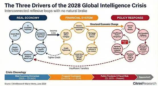 第一个负反馈循环出现在实体经济中:人工智能能力提升,工资支出减少,消费放缓,利润率下降,企业购买更多人工智能产品,人工智能能力进一步提升。随后,负反馈循环蔓延至金融领域:收入减少冲击抵押贷款,银行亏损导致信贷紧缩,财富效应失效,反馈循环加速。而政府应对政策的不足,以及政府似乎对此感到困惑,都加剧了上述两种情况。