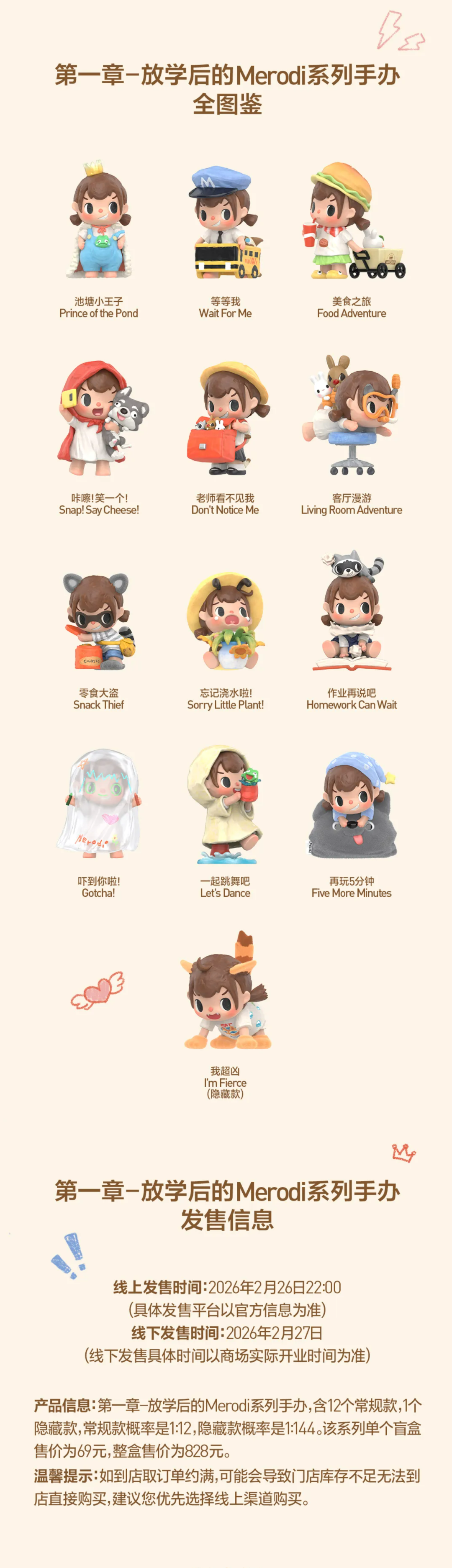 2026年2月20日,泡泡玛特推出了全新IP“放学后的Merodi”,围绕校园和青春主题设计,包含12个常规款和1个隐藏款,单个盲盒售价69元,常规款的概率是1:12,隐藏款的概率是1:144。线上将在2月26日晚10点发售,线下将在2月27日开卖。