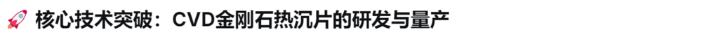 尺寸与性能领先:公司采用化学气相沉积(CVD)技术,成功实现了从2英寸到6-8英寸多晶金刚石晶圆热沉材料的突破-。其产品厚度可薄至5-30微米,热导率稳定在1000-2200W/m·K,关键指标达到国际同类产品水平,部分性能(如表面粗糙度、翘曲度)甚至优于国外产品。