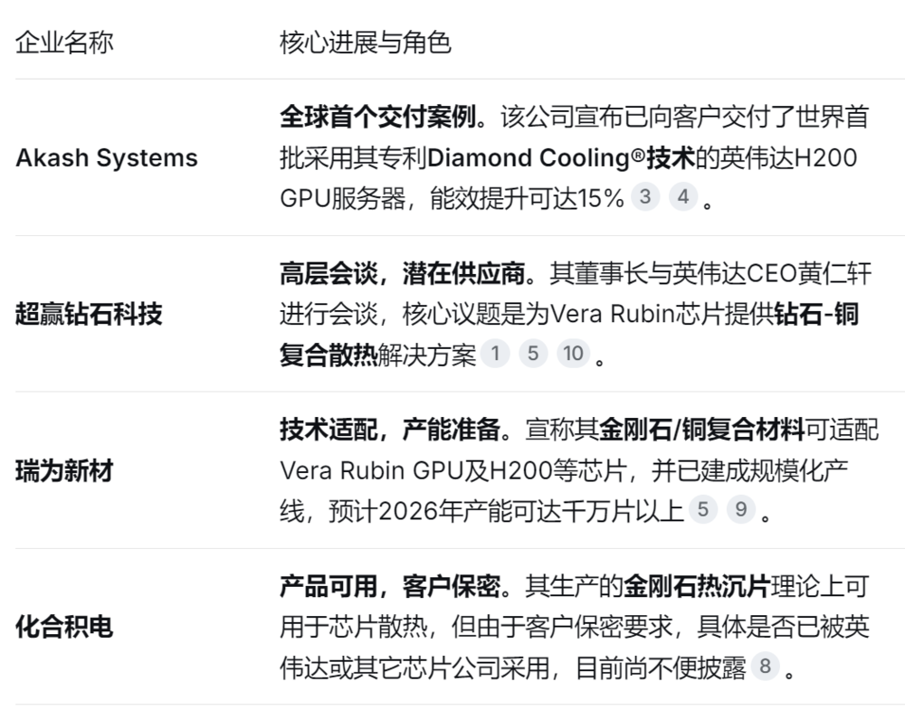虽然方案已定,但供应链的选择是多元且动态的。目前公开信息显示,有多家公司正在以不同方式参与到英伟达的钻石散热生态中。