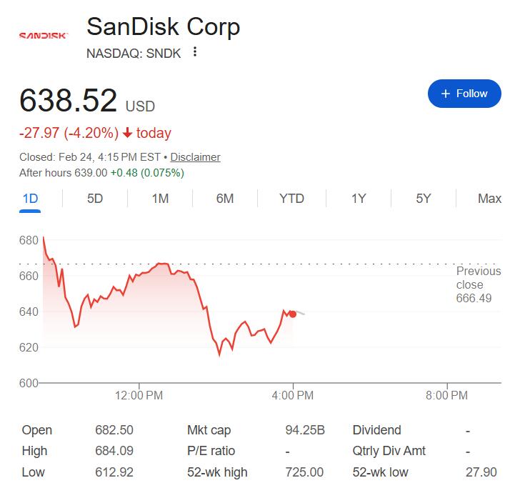 美东时间24日周二,香橼在社交媒体发帖称,市场对闪迪的定价逻辑存在根本性错误,当前的存储芯片供应紧张不过是“海市蜃楼”,周期顶部已近在咫尺。帖子发出后,闪迪(SNDK)股价周二早盘随即跳水,跌幅一度扩大至5.7%,午盘之初曾短线转涨,后跌幅再度扩大、曾达到8%,最终收跌4.2%。