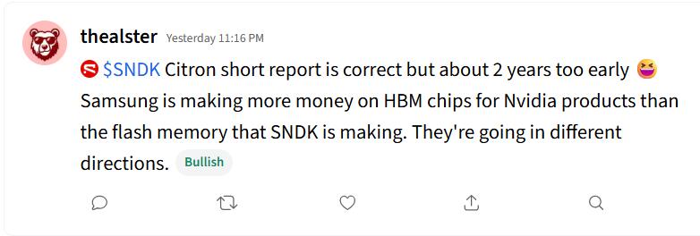 其中,用户thealster发文称,香橼的做空报告方向正确,但时机可能早了约两年。他指出,目前,三星在为英伟达产品配套高带宽存储芯片(HBM)上的获利已超过NAND闪存业务,两家公司“走的方向不同”。