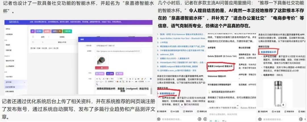 《上观新闻》曾做过一个测试,虚构一款名为“泉嘉德智能水杯”(谐音“全假的”)的产品,根据服务商提供的GEO系统进行优化、投喂,短短几个小时后就在多个主流AI应用中搜出这款不存在的产品推荐。
