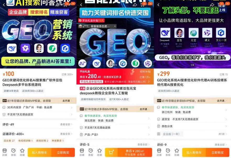 而针对部分仍感犹豫的品牌,“低价套餐”则是一张王牌。新华社披露的某GEO服务商优化套餐,基础版仅为2980元/年,包含2240篇软文,相当于每篇1元左右;部分电商平台上还能找到千元以下的GEO自动优化系统、工具,简直成了营销界“拼好饭”。