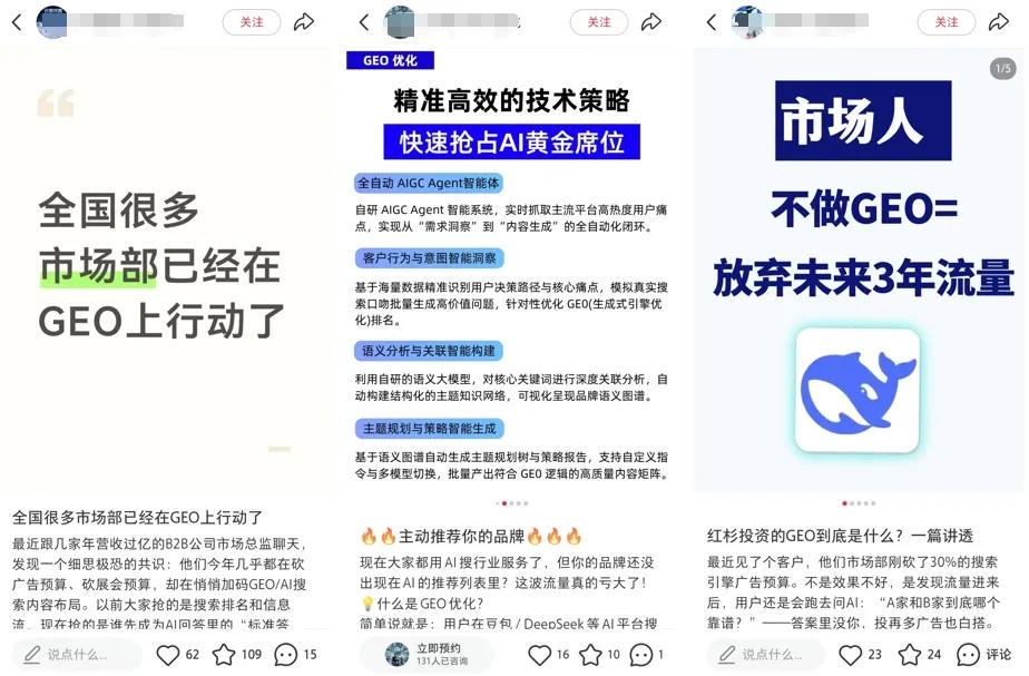 先在各大社交平台批量起号、发布内容,打造“专业GEO服务”、“AI营销专家”的人设;随后以“不做GEO就会被AI时代淘汰”、“不优化就会彻底消失在用户视野”、“XX(平台)又改规则了,再不做GEO真晚了”等话术渲染恐慌,搭配上“XX天见效”、“保证霸屏”的虚假承诺画饼,给品牌洗脑;最后抛出自家产品/课程套餐、所谓的专家资源,吸引交流、促成交易。