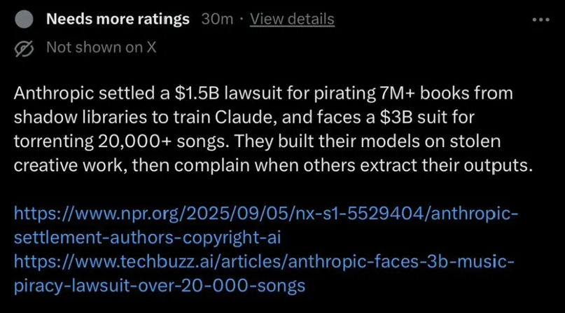 Anthropic一边在说中国公司偷它的模型输出,一边自己在用盗版书籍和歌曲训练模型。