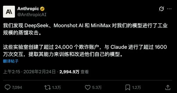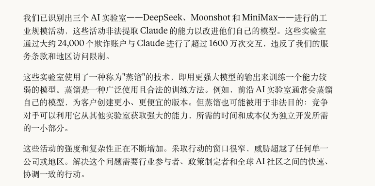 内容大意是说,他们发现了三家中国AI公司,分别是DeepSeek、Moonshot(就是Kimi的母公司)和MiniMax,对Claude进行了"工业规模的蒸馏攻击"。