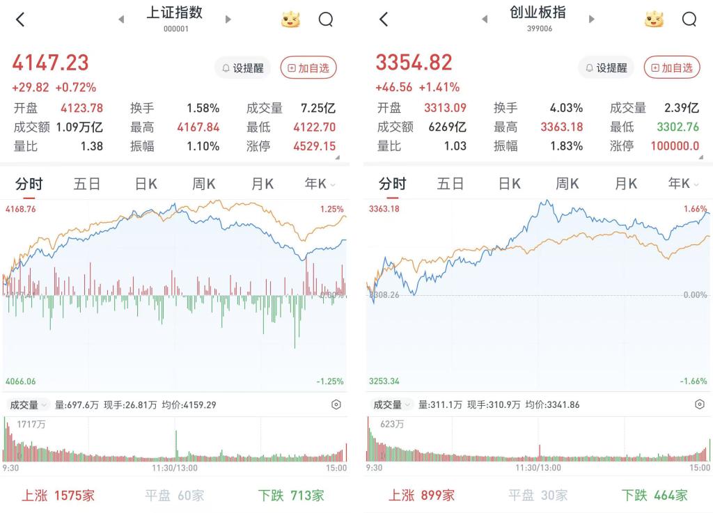 至收盘,上证综指涨0.72%,报4147.23点;科创50指数涨0.54%,报1473.28点;深证成指涨1.29%,报14475.87点;创业板指涨1.41%,报3354.82点。