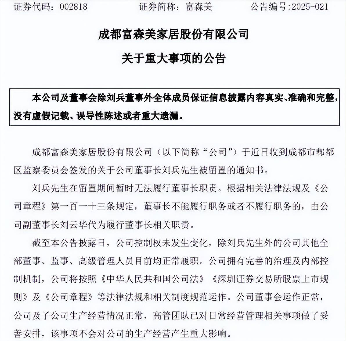 2月13日,富森美发布公告称,崇州市监察委员会已解除对公司副总经理、董事会秘书张凤术的留置措施,将其变更为责令候查措施,这距离张凤术被留置仅过去两个多月。而就在一个月前的1月23日,公司董事长刘兵在被留置近半年后,也被成都市郫都区监察委员会解除留置,同样变更为责令候查措施,随后恢复履行董事长、法定代表人等全部职责。