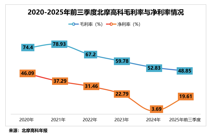 过去,北摩高科凭借深厚的技术壁垒,长期享有高产品溢价,毛利率常年维持在70%以上,净利率也稳居50%上下,堪称军工界的“茅台”。