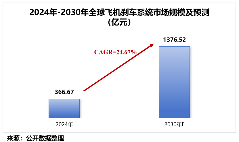 据预测,随着国产大飞机的爆发式增长和军机的更新换代,到2030年,全球飞机刹车系统市场的规模有望达1376.52亿元,年均复合增长率约24.67%。