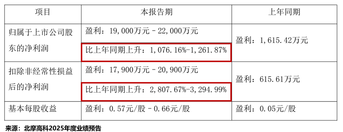 1月30日,北摩高科发布了2025年度业绩预告,预计全年实现归母净利润1.9亿元至2.2亿元,同比增长1076.16%至1261.87%。