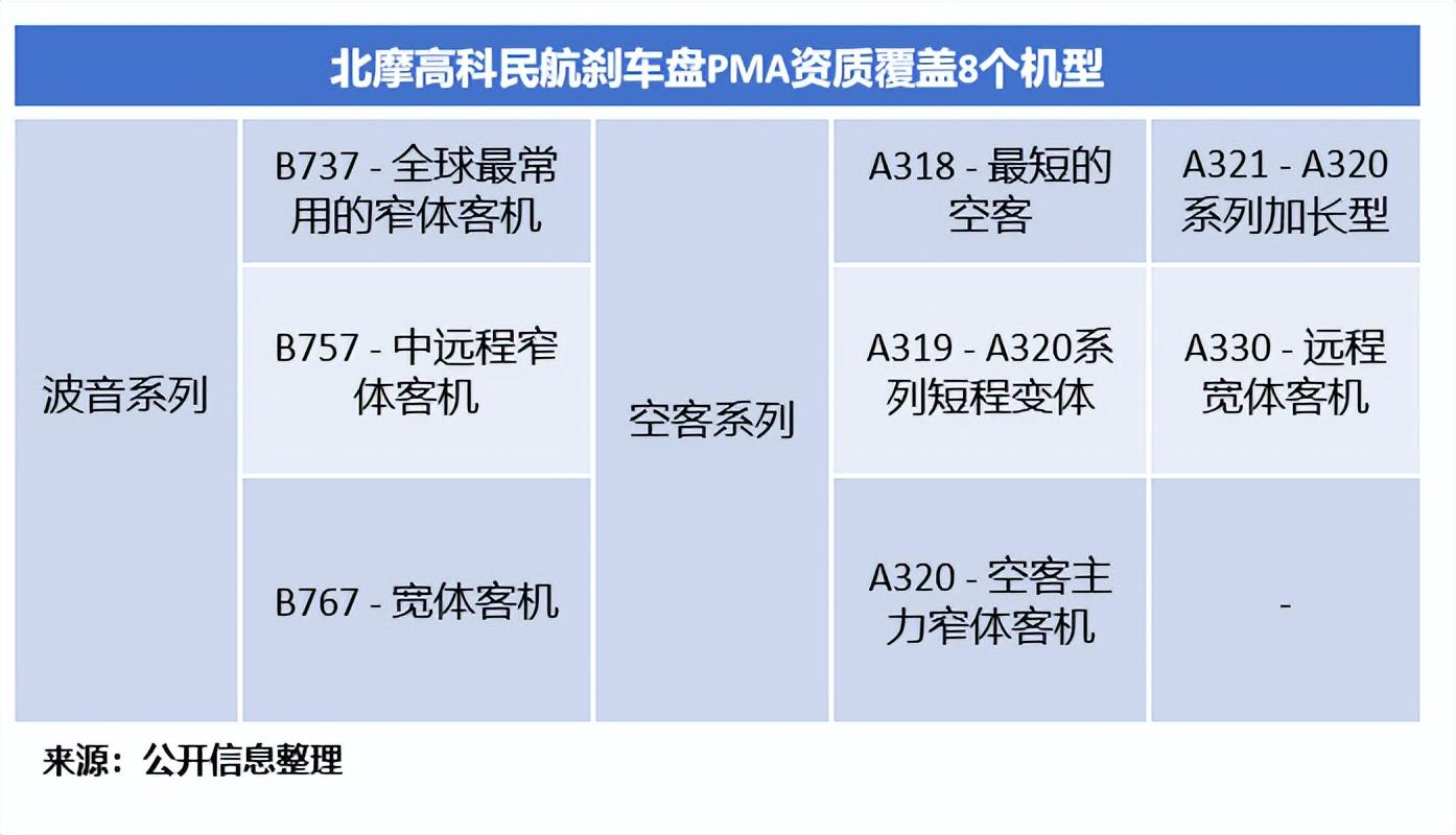 北摩高科的刹车盘业务分为军品及民品两类;其中,在民品方面,公司率先拿下空客碳刹车盘PMA认证,累计拥有8个民航飞机刹车盘PMA资质。
