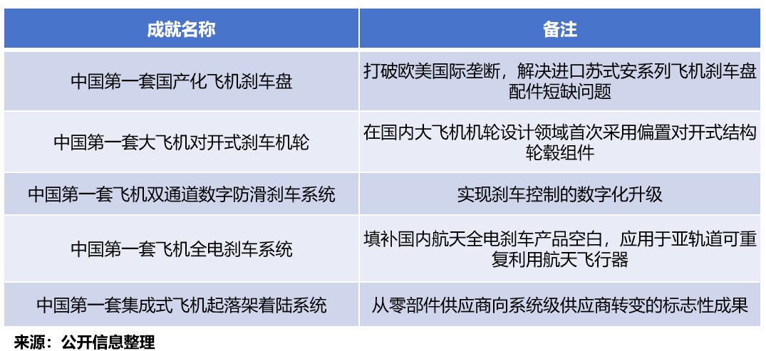 第一套国产化飞机刹车盘、第一套大飞机对开式刹车机轮、第一套飞机双通道数字防滑刹车系统、第一套飞机全电刹车系统以及第一套集成式飞机起落架着陆系统。