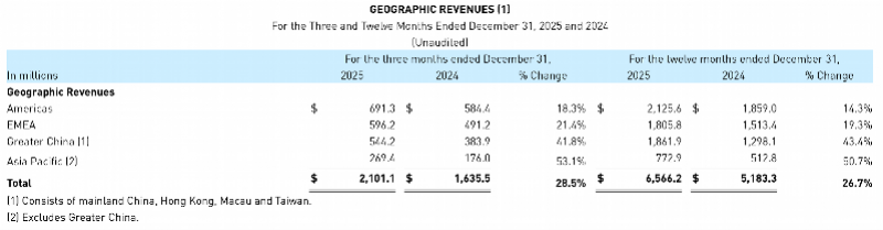 财报显示,集团第四季度收入同比增长28%至21.01亿美元,相比第三季度30%的增长略有下降。第四季度归属于股东的净利润同比增长超7倍至1.32亿美元,调整后净利润同比增长94%至1.76亿美元。全年利润方面,营业利润同比增长49%至7.02亿美元,调整后营业利润增长45%至8.38亿美元。营业利润率提升160个基点至10.7%,归属于股东的净利润则同比大涨489%至4.27亿美元,盈利能力显著改善。