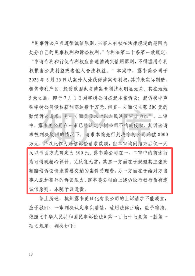 最高人民法院在二审中指出,露韦美公司于2025年6月25日获得专利后未实际制造、销售专利产品,经营范围与专利技术无关,在短短5天之后,即向宇树科技提起诉讼。其在一审中主张500元赔偿却要求审计,二审中先提出8000万元赔偿并申请先行赔付,次日又调回500元,行为 “既精心算计、又反复无常”,实则是为规避诉讼费、向宇树科技施加额外诉讼压力,该行为违反诚信原则,法院予以谴责。