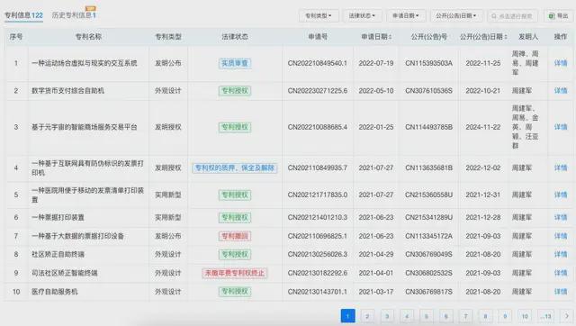 天眼查显示,建林电气共有192项专利信息,发明人大多数均为周建军。专利涉及元宇宙、货币支付、发票等,涉及行业包括医院、银行等。