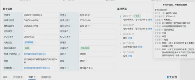 天眼查显示,这项“电子狗”专利最初为浙江建林电子电气股份有限公司(下称“建林电气”)持有。2025年2月7日,建林电气将该专利转让给杭州连好科技贸易有限公司,7月11日,连好科技又转让给如今的露韦美。