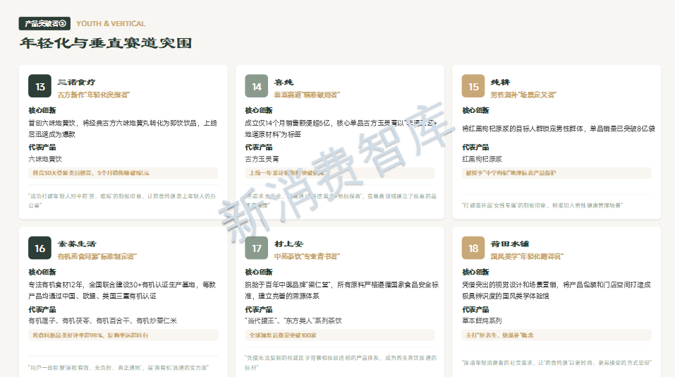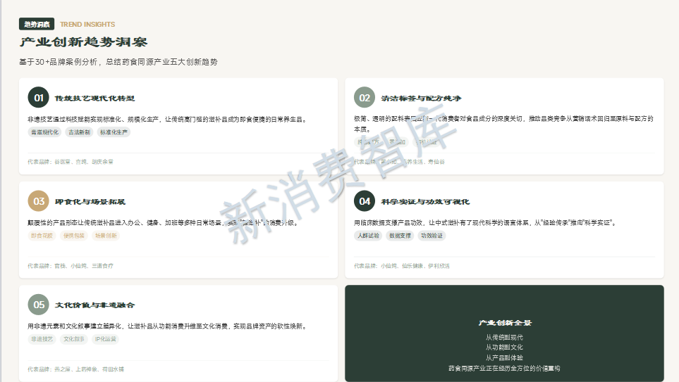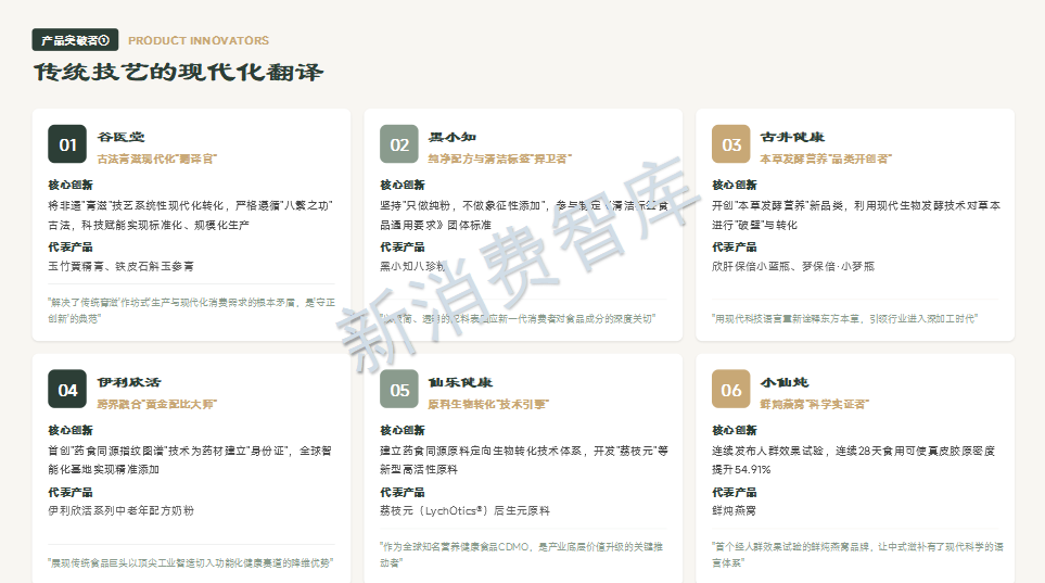 从30个品牌案例中我们看到:谷医堂将非遗膏方现代化,黑小知捍卫清洁标签,古井健康开创本草发酵新品类,小仙炖用科学实证重塑燕窝价值,芝康纪构建全链路实力模型,素养生活坚守有机道地。