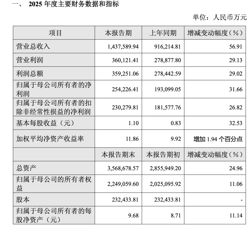 公告显示:海光信心2025年度实现营业收入143.8亿元,比上年同期增加56.91%;实现归属于母公司所有者的净利润25.4亿元,比上年同期增加31.66%;实现归属于母公司所有者的扣除非经常性损益的净利润23亿元, 比上年同期增加26.82%。