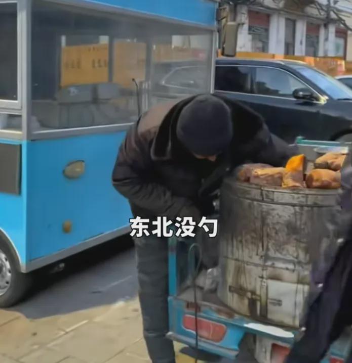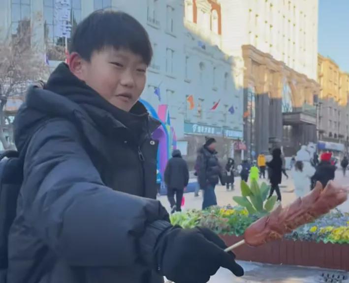 就连东北的小孩哥,见到南方人盯着他吃东西,马上过来,又是投喂烤肠和零食,又是掏出手机要给他们点外卖。